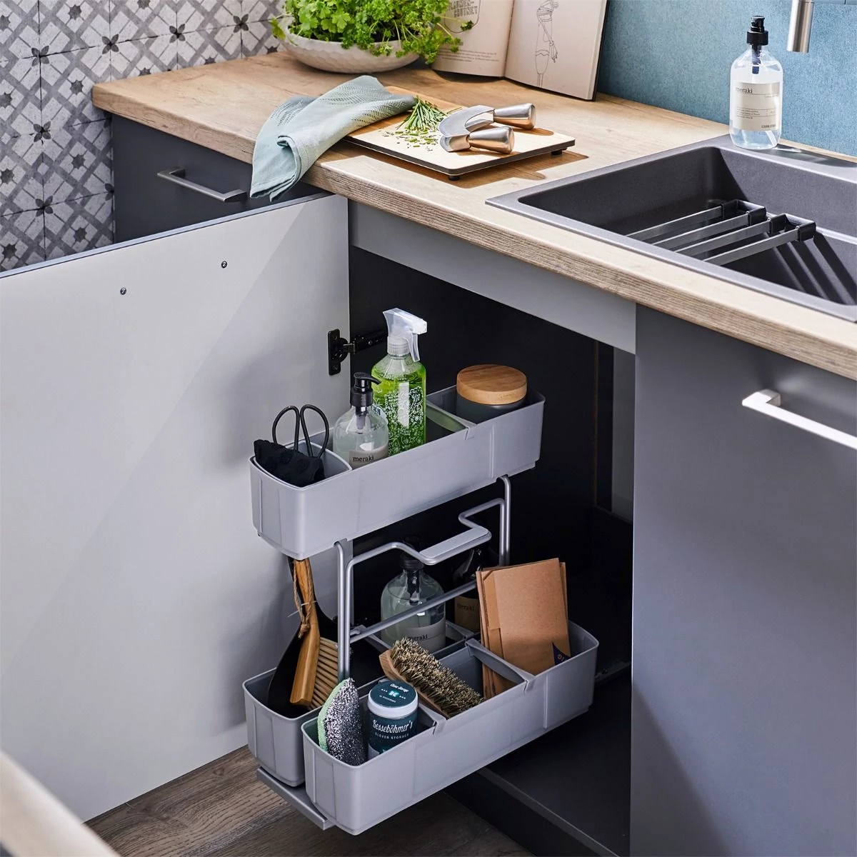 - A tisztítószerek kivétele egyetlen ujjal egyszerű – a behúzás finom és csendes a SoftStop mechanizmusnak köszönhetően.