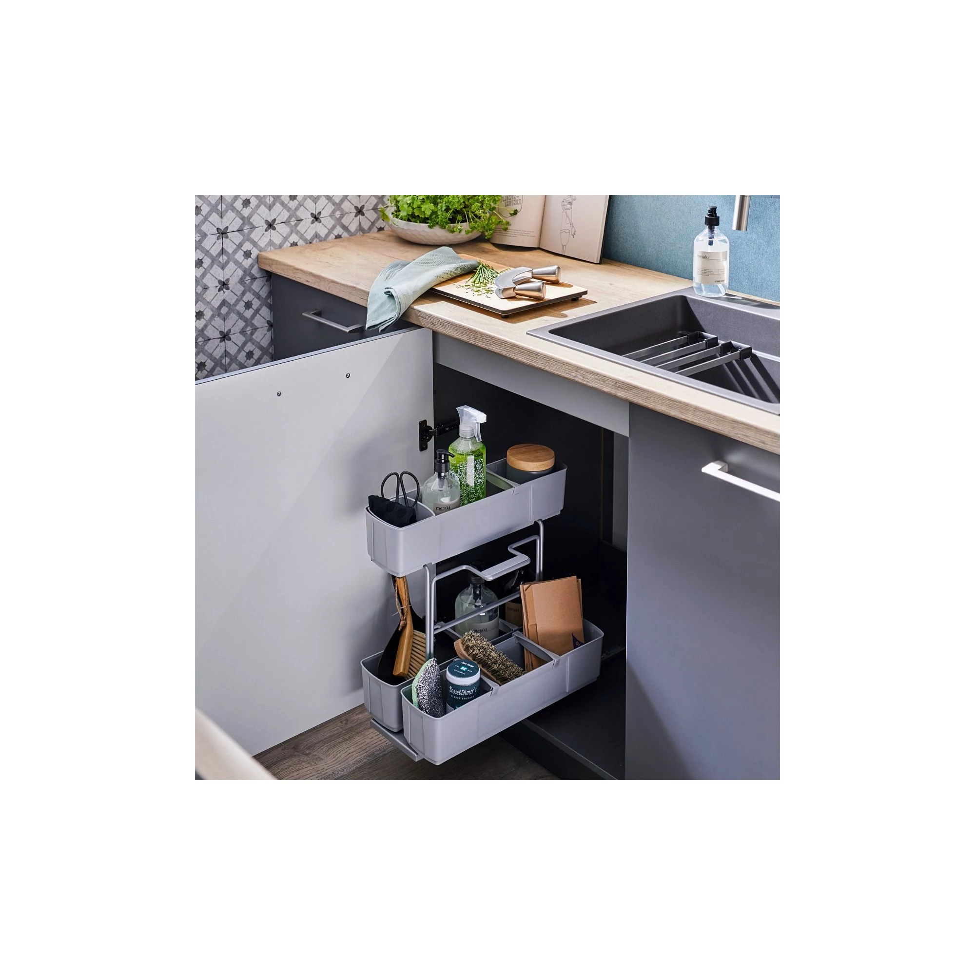 - A tisztítószerek kivétele egyetlen ujjal egyszerű – a behúzás finom és csendes a SoftStop mechanizmusnak köszönhetően.