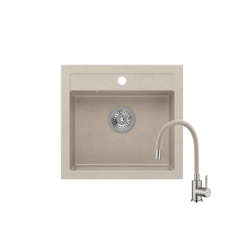 JOHNNY 500 x 470 mm homok gránit mosogatótálca + rozsdamentes acél csaptelep beige, flexibilis kifolyócsővel